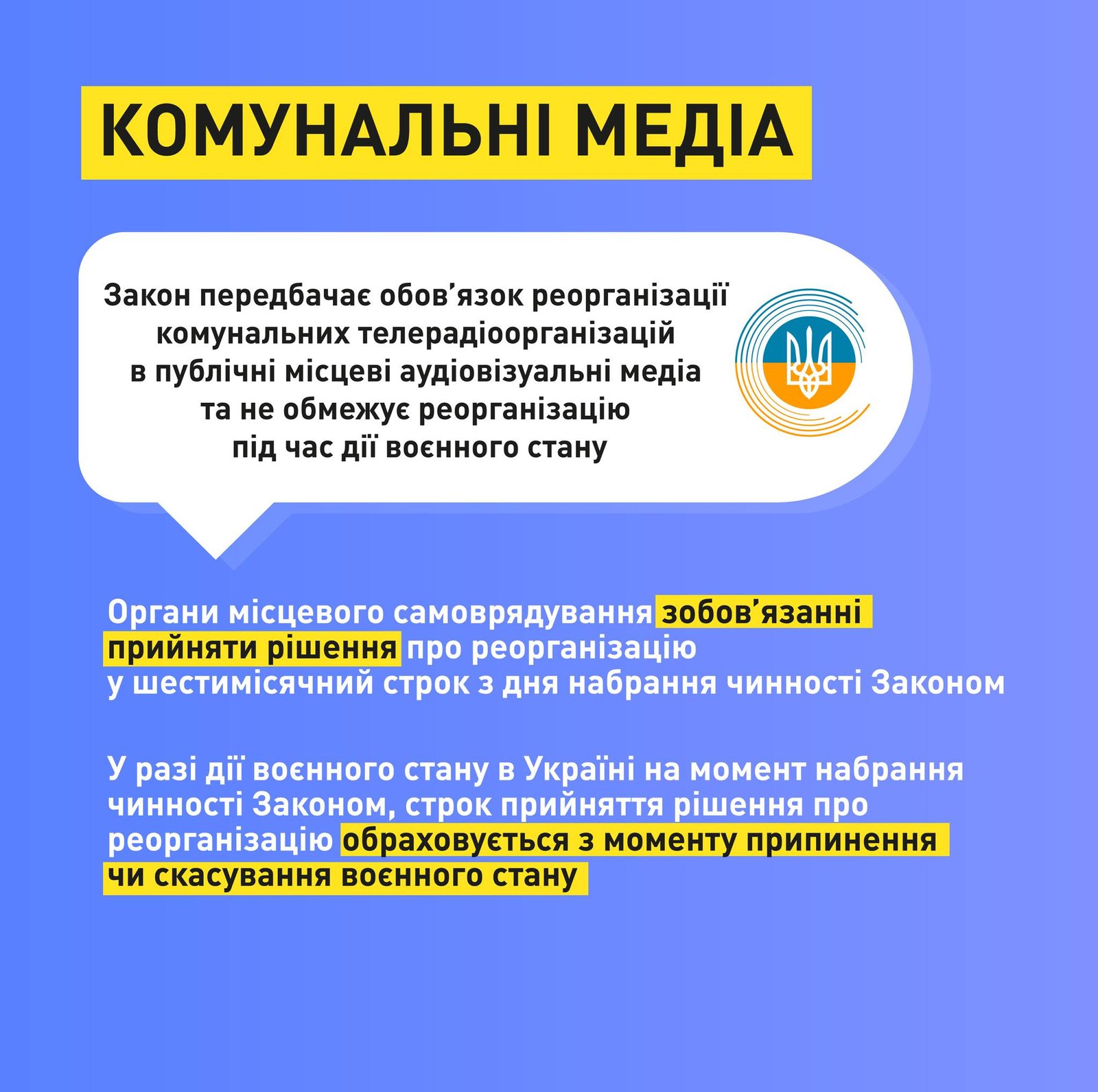 Нормативний акт, крім іншого, містить вимогу про те, що протягом року комунальні ЗМІ повинні перетворитися в локальні аудіовізуальні публічні медіа.