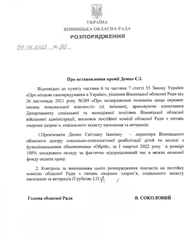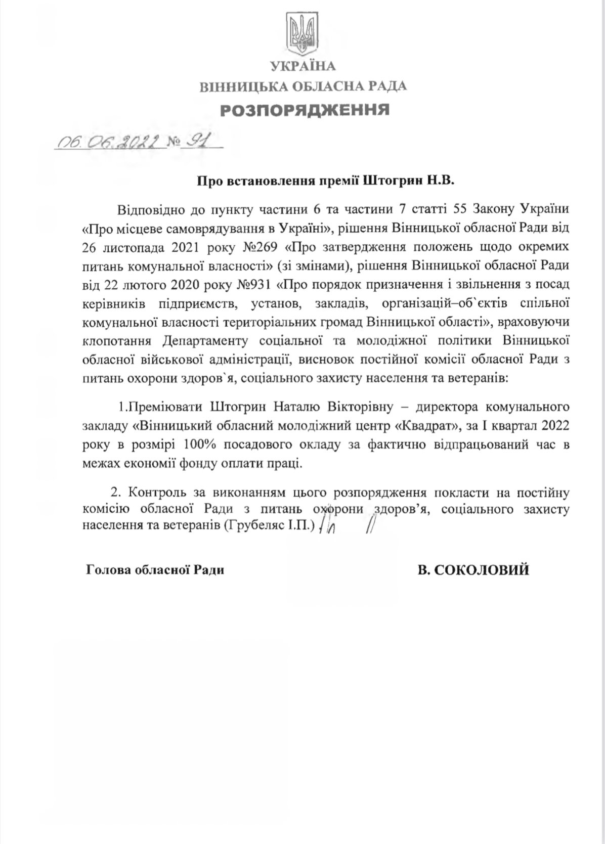 Натомість голова облради вирішив піти ще далі і окрім надбавок до посадових окладів ще й преміював окремих керівників обласних комунальних закладів у розмірі 100% посадового окладу за перший квартал.
