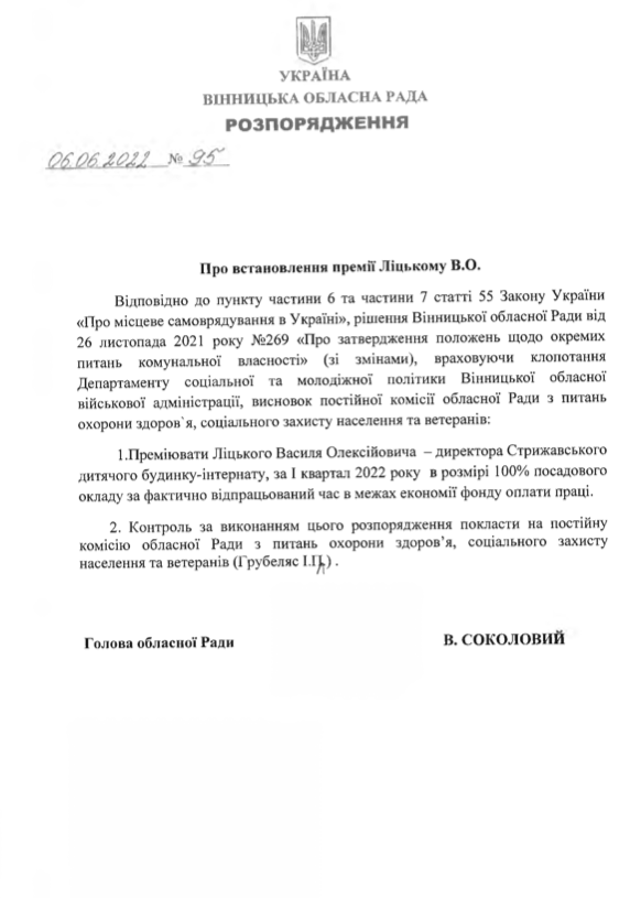 • Нещодавно ми повідомляли, що постійні комісії обласної ради висловилися у підтримку розпорядження голови ради Вячеслава Соколового (Українська стратегія Гройсмана) про дозвіл керівникам комунальних підприємств нараховувати собі надбавки. Відтак справа лише за простим підписом голови під розпорядженням — і директори, начальники та головні лікарі матимуть право виписувати собі додаткові до зарплати нарахування під час війни.