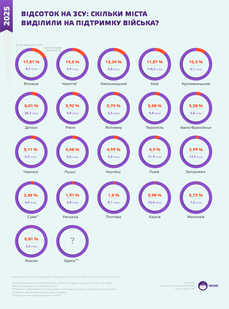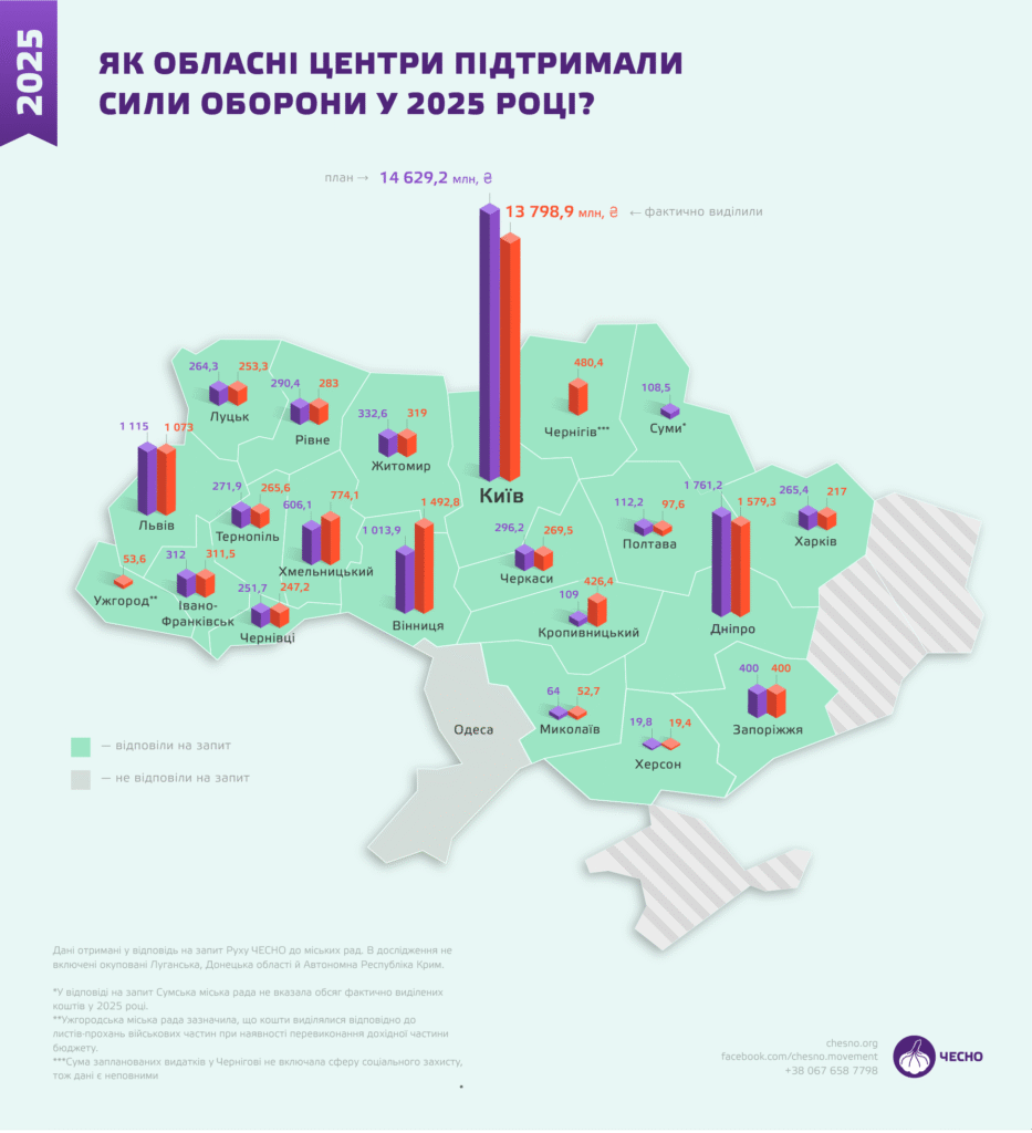 За даними аналізу Руху ЧЕСНО, у 2025 році найбільше коштів у грошовому вимірі на потреби ЗСУ виділив Київ.